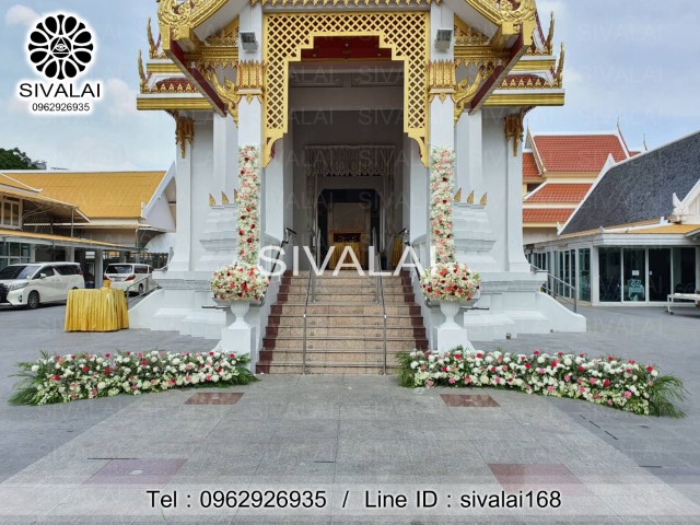 กระถางโรมัน 2 ใบ + สวนใบแซมดอกไม้ + ดอกไม้กรอบรูป + ดอกไม้ประดับเสาเมรุ 2 เส้น