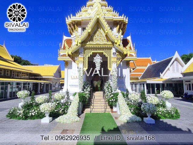 นกยูง 2 ตัว + กระถางโรมัน 8 ใบ + สวนใบแซมดอกไม้ + ดอกไม้กรอบรูป + ดอกไม้ประดับเสาเมรุ 2 เส้น + ดอกไม้ราวบันได
